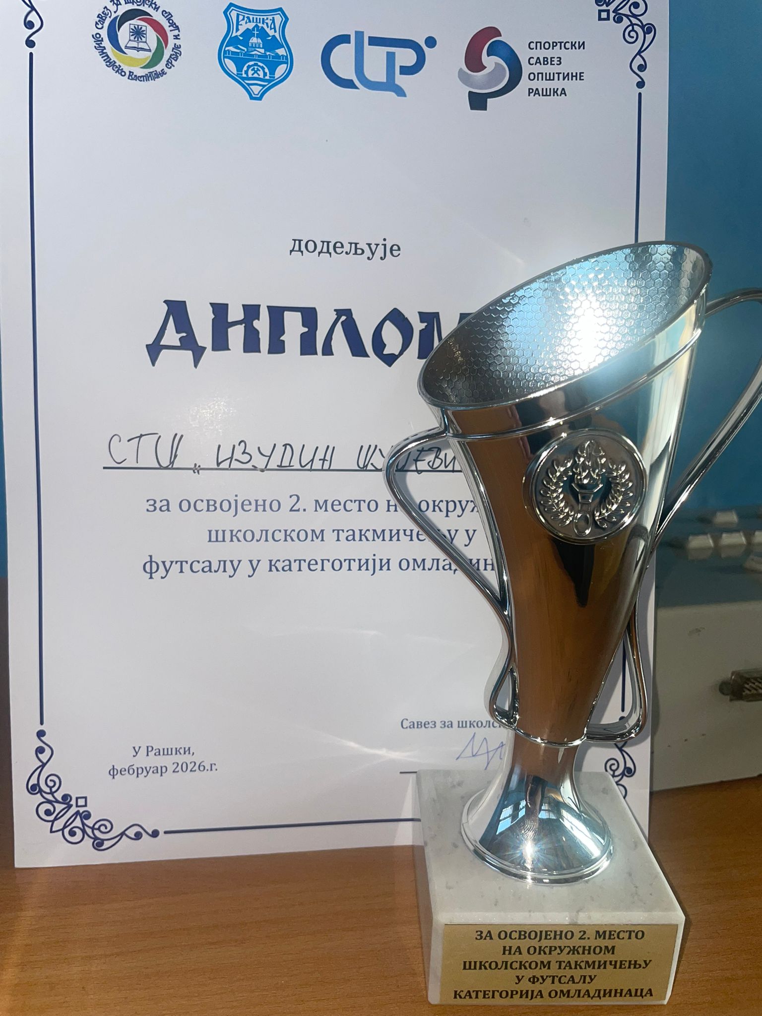 Nakon sto su ucenici naše škole osvojili prvo mesto na opštinskom takmičenju u malom fudbalu (futsalu),dobili smo pozivno pismo za učešće na okružnom takmičenju koje je odrzano 26.2.2026 god u Raškoj. Pored naše škole učešće su uzeli i ESTŠ”Nikola Tesla” iz Kraljeva i “Gimnazija ” Raška. Žrebom je određeno da prvu utakmicu igraju Tehnička škola “Izudin Šušević” i ESTŠ “Nikola Tesla” iz Kraljeva,dok je “Gimnazija ” Raška bila slobodna. Utakmica je protekla u fer i sportskom duhu, uz veliko zalaganje svih učesnika.,a ubedljivu pobedu je ponela Tehnička škola”Izudin Šušević. Nakon kratke pauze od 15 min počela je i finalna utakmica izmedju domaćina tj. “Gimnazija” Raška i Tehnička škola Izudin šušević” iz Novog Pazara. Naši učenici dali su maksimum, pokazali disciplinu,požrtvovanost i sportsko ponašanje na terenu,ali je na kraju umor preovladao i uticao na pad koncentracije i fizičke spremnosti u završnici meča predtavnika naše škole što je rezultiralo porazom. Bez obzira na gubitak i osvojeno II mesto ponosni smo na njihov trud, borbenost i odgovornost koju su pokazali tokom celog takmičenja.